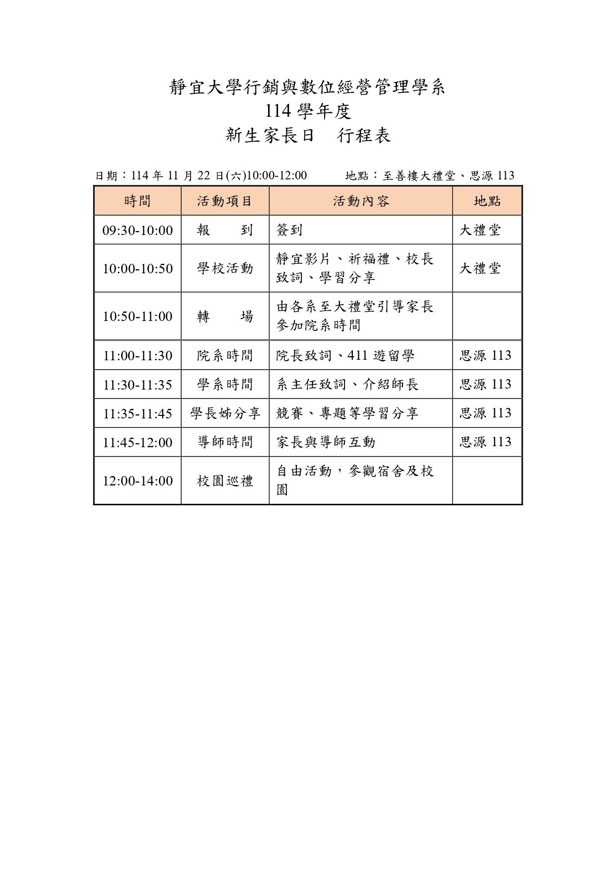【最新消息】114學年新生家長日(114/11/22)行程表