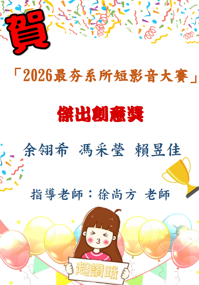 本系學生榮獲2026最夯系所短影音大賽-傑出創意獎〕🎉